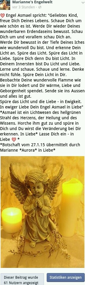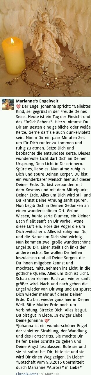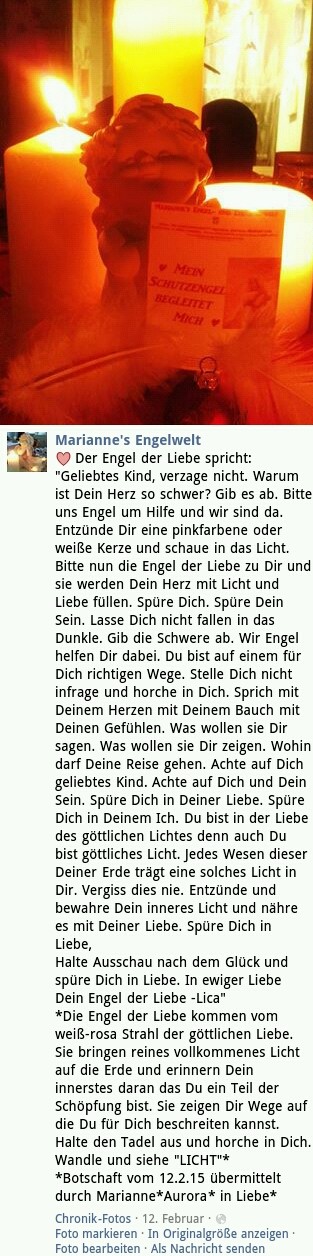 Die aktuellsten Botschaften findest Du ganz öffentlich auf Facebook nutze einfach unseren Link auf der Willkommen-Seite. Und ganz neu auch auf Instagram @lichtarbeit_des_herzens